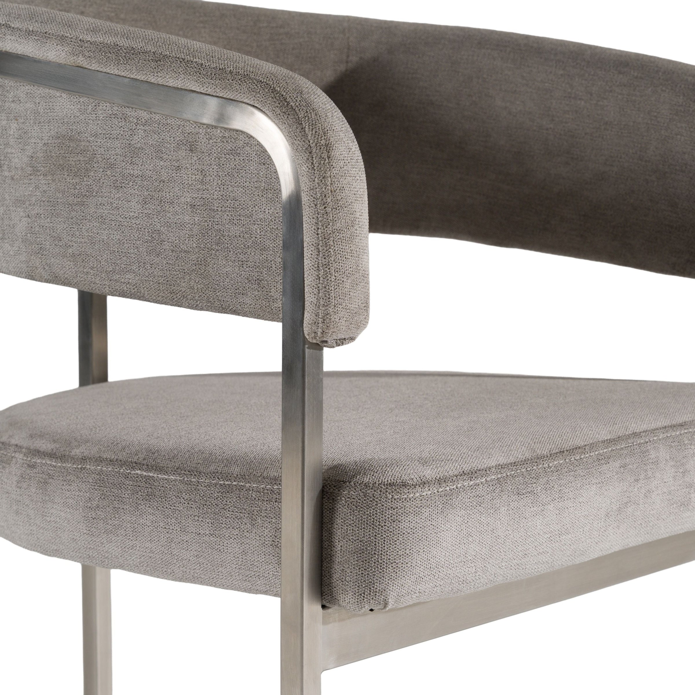 The Villa dining chair exudes contemporary elegance with its modern grey fabric upholstery and sleek stainless steel frame. Featuring a gently curved back and armrests, this chair offers both comfort and style, making it a perfect addition to any dining space. The minimalist design highlights clean lines and a sophisticated aesthetic, while the combination of fabric and metal creates a chic, inviting atmosphere. This versatile chair is ideal for modern interiors, seamlessly blending functionality with visual appeal.